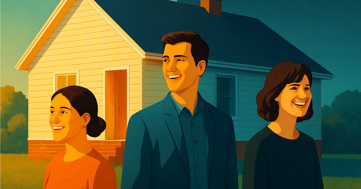 ein Bild mit drei glücklichen Personen, welche als Erben stehen in einer art COmicstil,