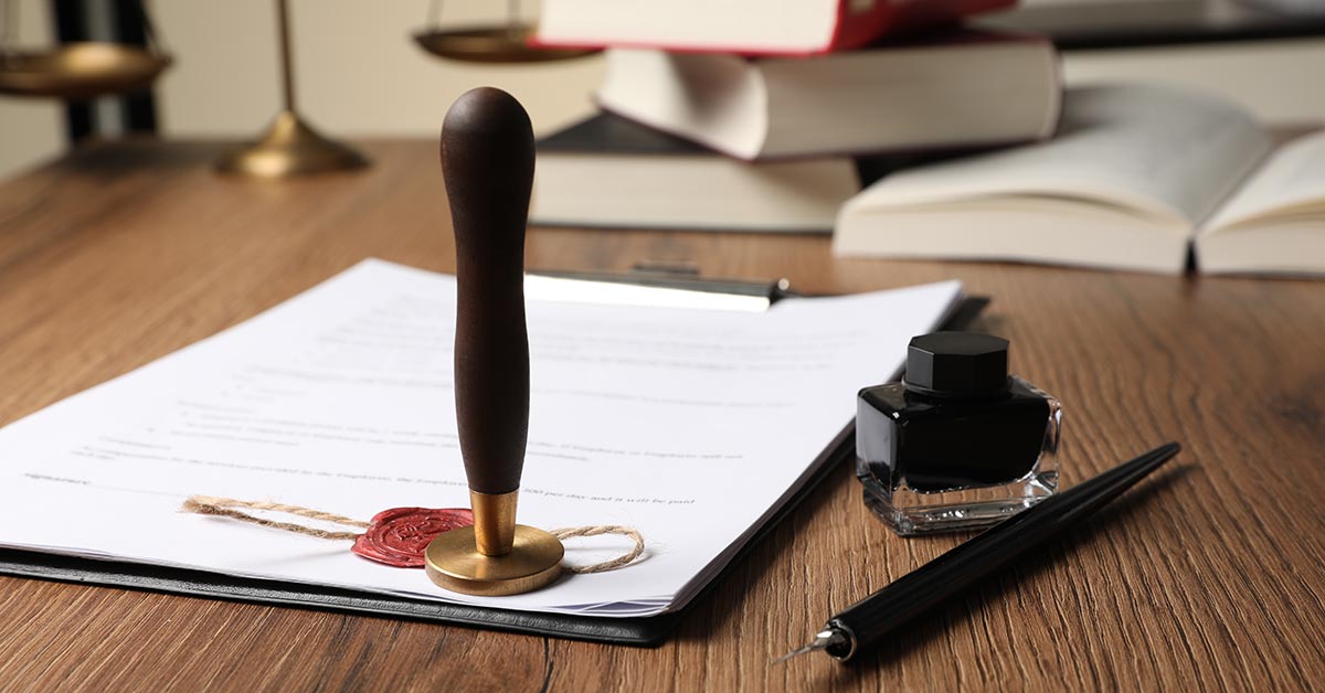 Notarielle Urkunde mit Siegelstempel, Tintenfass und Feder auf einem Holztisch – Symbolbild für Testament, Erbschaft oder rechtliche Beglaubigung | Notartermin