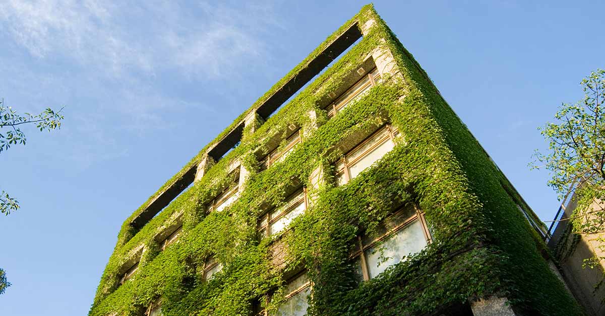 Ein mit Pflenzen bewachsenes Mehrfamilienhaus, für besonders gute Energieeffizienz, was den Immobilienwert beeinflusst | Immobilienbewertung