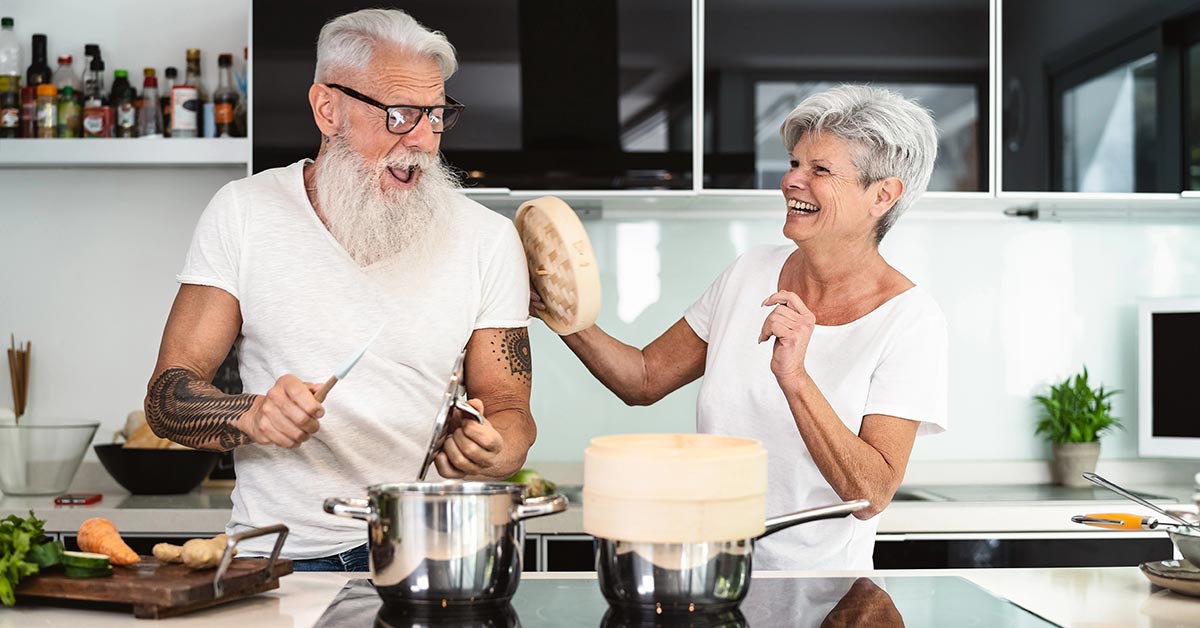 Ein Seniorenpaar steht glücklich in der neuen, kleineren und altersgerechten Wohnung und albert herum | Wohnen im Alter